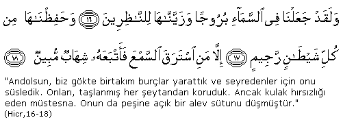"De ki: Cinlerden bir topluluðun dinleyip de þöyle söyledikleri bana vahyolunmuþtur: Gerçekten biz, hârikulâde güzel bir Kur'an dinledik. Doðru yola iletiyor, ona iman ettik. Kimseyi Rabbimize asla ortak koþmayacaðýz. Hakikat þu ki, Rabbimizin þâný çok yücedir. O, ne eþ ne de çocuk edinmiþtir. Doðrusu bizim beyinsiz olanýmýz, Allah hakkýnda pekaþýrý yalanlar uyduruyormuþ. Halbuki biz, gerek insanlar gerekse cinler Allah hakkýnda asla yalan söylemezler, sanmýþtýk. Þu da gerçek ki, insanlardan bazý kimseler, cinlerden bazý kimselere sýðýnýrlardý da, onlarýn taþkýnlýklarýný arttýrýrlardý. Onlar da sizin sandýðýnýz gibi, Allah'ýn hiç kimseyi tekrar diriltmeyeceðini sanmýþlardý. Doðrusu biz, göðü yokladýk, fakat onu sert bekçilerle, alev huzmeleriyledoldurulmuþ bulduk. Halbuki, biz onun bazý kýsýmlarýnda dinlemek için oturacak yerler (bulup) oturuyorduk; fakat þimdi kim dinlemek isterse, kendisini gözetleyen bir alev huzmesi buluyor. Bilmiyoruz, yeryüzündekilere kötülük mü murat edildi, yoksa Rableri onlara bir hayýr mý diledi? Gerçekten biz, -kimimiz sâlih kiþiler, kimimiz ise bunlardan aþaðýda olmak üzere- türlü türlü yollar tutmuþtuk. Þu gerçeði þüphesiz anladýk ki, biz yeryüzünde bulunsak da Allah'ý âciz býrakamayacaðýz, baþka yere kaçmakla da elinden kurtulamayacaðýz. Doðrusu biz, o hidayeti iþitince ona iman ettik. Kim Rabbine iman ederse, artýk ne bir eksikliðe uðratýlmasýndan ne de haksýzlýk edilmesinden korkar. Ýçimizde, teslimiyet gösterenler de var, hak yoldan sapanlar da var. Teslimiyet gösteren kimseler, doðru yolu arayanlardýr. Hak yoldan sapanlara gelince, onlar cehenneme odun olmuþlardýr." (Cinn Suresi 1-15)
